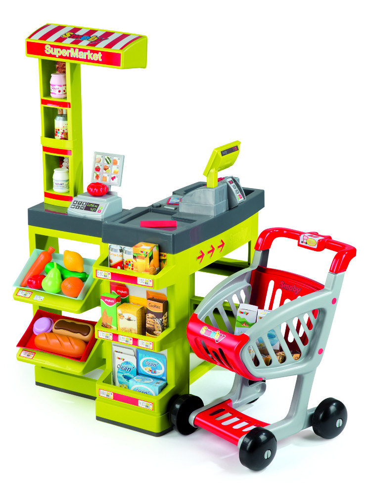 Supermarket v novém provedení! Elektronická pokladna se zvuky a světly má zabudovaný funkční skener - zboží stačí umístit před pokladnu pro načtení ceny, jako v opravdové prodejně! Nechybí ani váha na ovoce a zeleninu. Nákupní vozík i zboží jsou součástí balení. Rozměry: 44 x 56 x 86 cm. číst celé