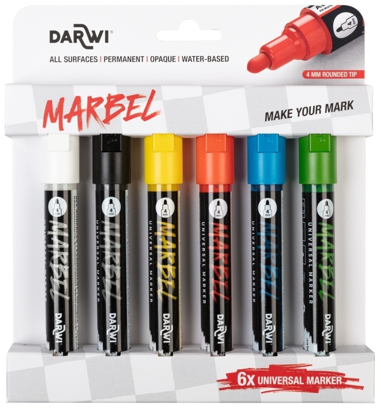 Zestaw 6 uniwersalnych markerów MARBEL.Kolory: Biały, Czarny, Słoneczny Żółty, Czerwony-Cynober, Cyjan, Zieleń Pasikonika.Niezależnie od tego, czy chcesz naszkicować arcydzieło, nadać osobisty charakter codziennemu przedmiotowi, czy uwolnić swą kreatywność na różnych materiałach.MARBEL to idealny...