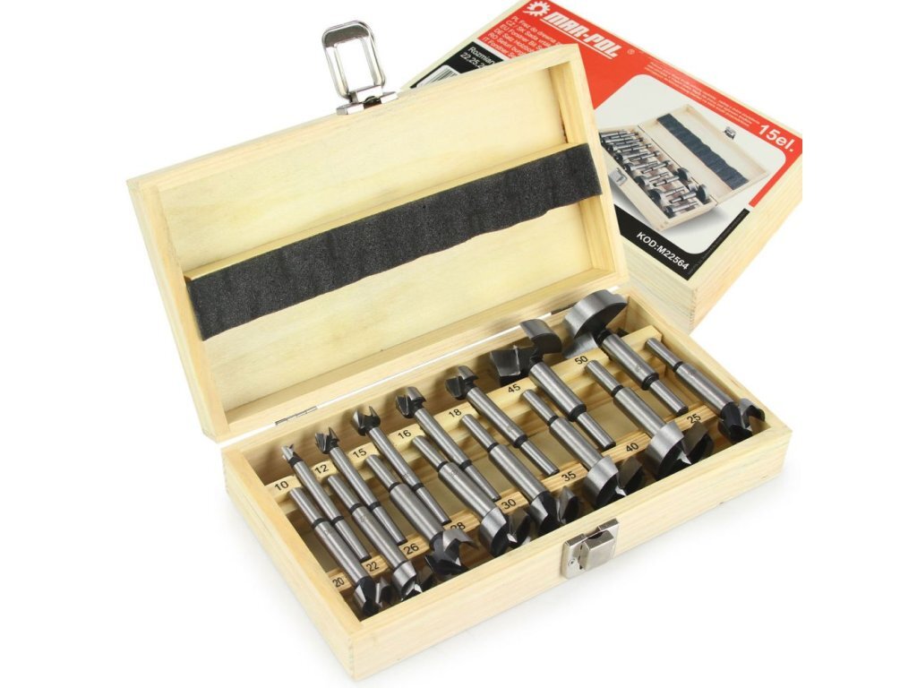 Sada fréz, sukovníků do dřeva 10-50mm, 15ks MAR-POLSada 15 ks stopkových fréz - sukovníků do dřeva o rozměrech 15 - 50 mm v dřevěném pouzdře. Středový hrot zajišťuje přesné umístění vrtáku, hrany břitů zajišťují přesné vrtání otvorů bez vylamování. Určeno pro vrtání přesných otvorů bez trhání...