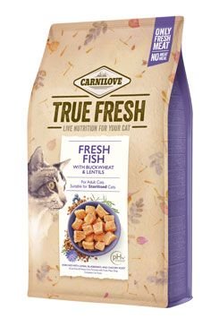 CARNILOVE TRUE FRESH FISH. Receptura bez obilovin a brambor pouze s čerstvým masem pro dospělé kočky. Vhodné pro kastrované kočky. Kompletní krmivo pro kočky.Složení: čerstvá ryba (70 %), hrachový protein, červená čočka, pohanka (4 %), přírodní aromata, kuřecí tuk, lososový olej (1 %), chlorid...