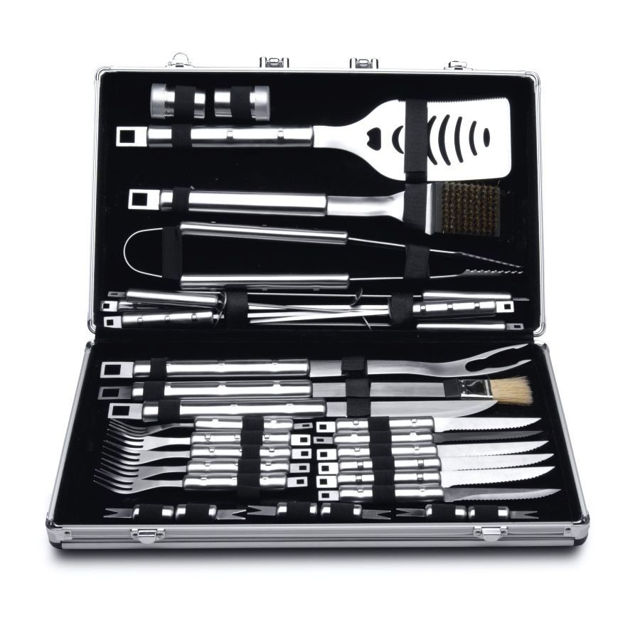 bohatě vybavená MAXI sada grilovacího náčiní v přenosném kufruvysoce kvalitní nerezová ocel typu X20Cr13široké spektrum využití nejen při grilování ale i v kuchynikaždé nářadí disponuje očkem pro zavěšení na různé držáky a háčkyvše pečlivě uskladněno v ocelovém uzavíratelném kufříku s... číst celé