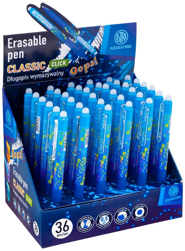 Długopis wymazywalny Astra Pen Oops! vám umožní snadno opravovat chyby - díky vymazatelné modré náplni se nemusíte bát nepřesností nebo překlepů. Ideální pro všechny, kdo chtějí mít své poznámky vždy perfektně upravené.