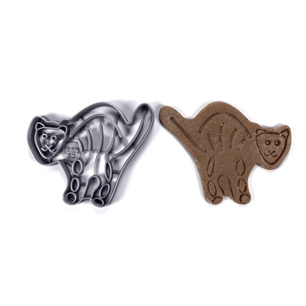 Vykrajovátko hrozivé kočičí kostry tiskneme na 3D tiskárně zpracováním plastového materiálu PLA (biologicky odbouratelný), odolný do 50°C, nevhodný do myčky na nádobí. Středová linie vykrajovátka zajistí exaktní vzhled a usnadní zdobení. Využití najdete při práci s jedlými těsty (na perníčky,...