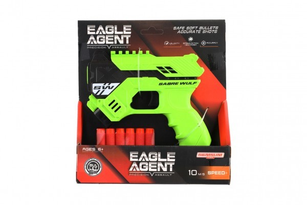 Pistole na pěnové náboje 16cm plast + 6ks nábojů 3 barvy v krabici 20x22x5cm