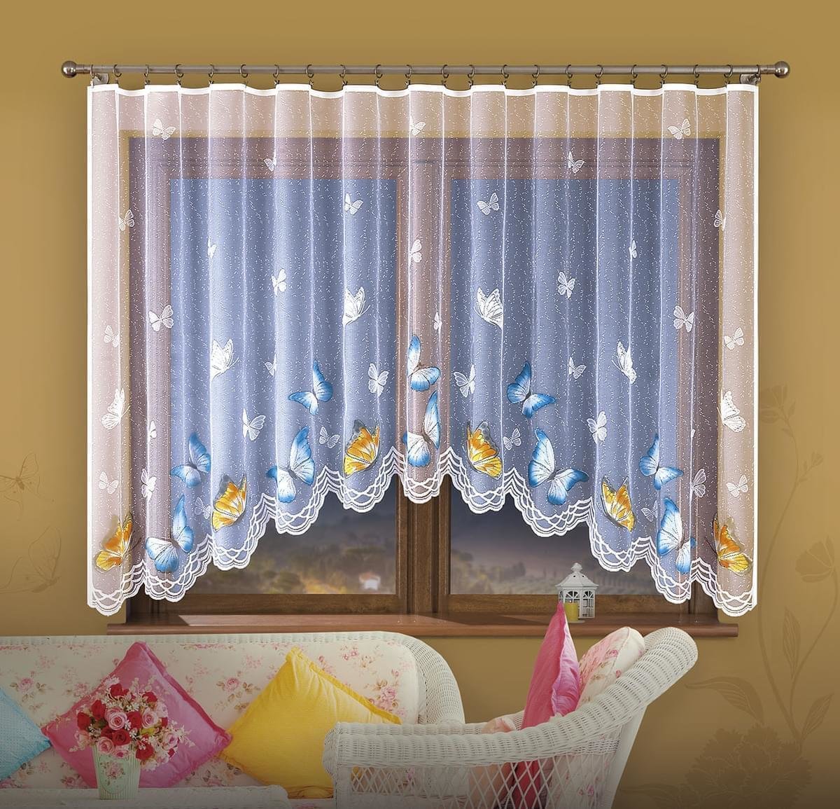 Atraktivní žakárová záclona v bílém provedení v krásném decentním dezénu motýlů v barvě modré a žlutooranžové. Materiál: 100 % žakárový polyesterBarva záclona: bíláBarva vzoru: bílá, modrá a žlutooranžováRozměr: 300 x 150 cmVýrobní zakončení bokůMožnost došití řasící lemovky číst celé