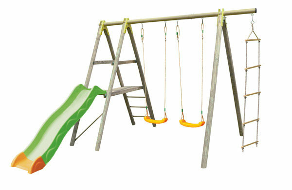 230cm široká sestava-2 sedátka+1 pro­vazový žebřík+klouzačka s nástupní plošinkou, kombinace kovové vrchní tyče s dřevěnými stojnami – lepší integrace do venkovní zahrady číst celé