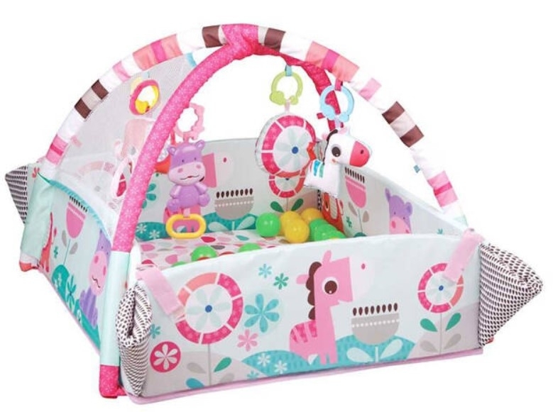 Icom dětská hrací deka 5v1 s chrastítky a balónky, Safari, růžová