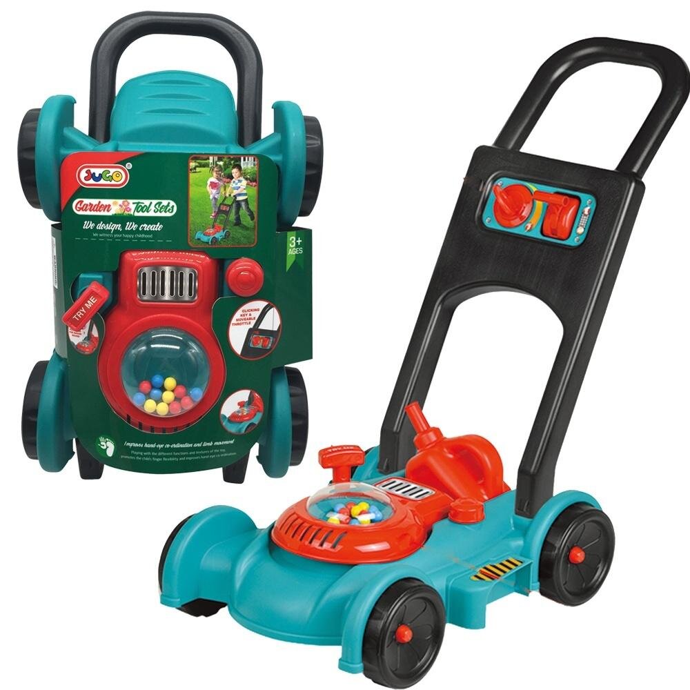 Kosiarka do trawy Kosiarka posiada rączkę, imitację startera silnika spalinowego, po pociągnięciu za rączkę słychać charakterystyczny dźwięk. Podczas popychania kosiarki, w koparce podskakują kolorowe kuleczki. W zestawie z kosiarką znajduje się również kanister do "uzupełniania benzyny". wymiary...