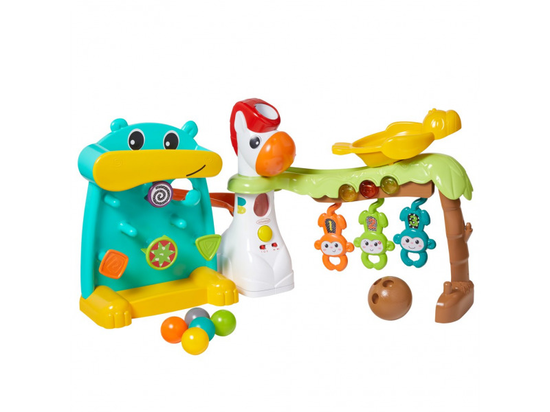 Hrací pult v krásném provedení s hrochem, žirafou a opičkami nabízí čtyři různé hry s míčky včetně hrajícího a svítícího bowlingu s opičkami. Hračka nabízí 15 různých melodií a zvuků.Dítě se při hraní s pultem učí příčině a následku i koordinaci pohybů při chytání míčků či trefování opiček.Vhodné...