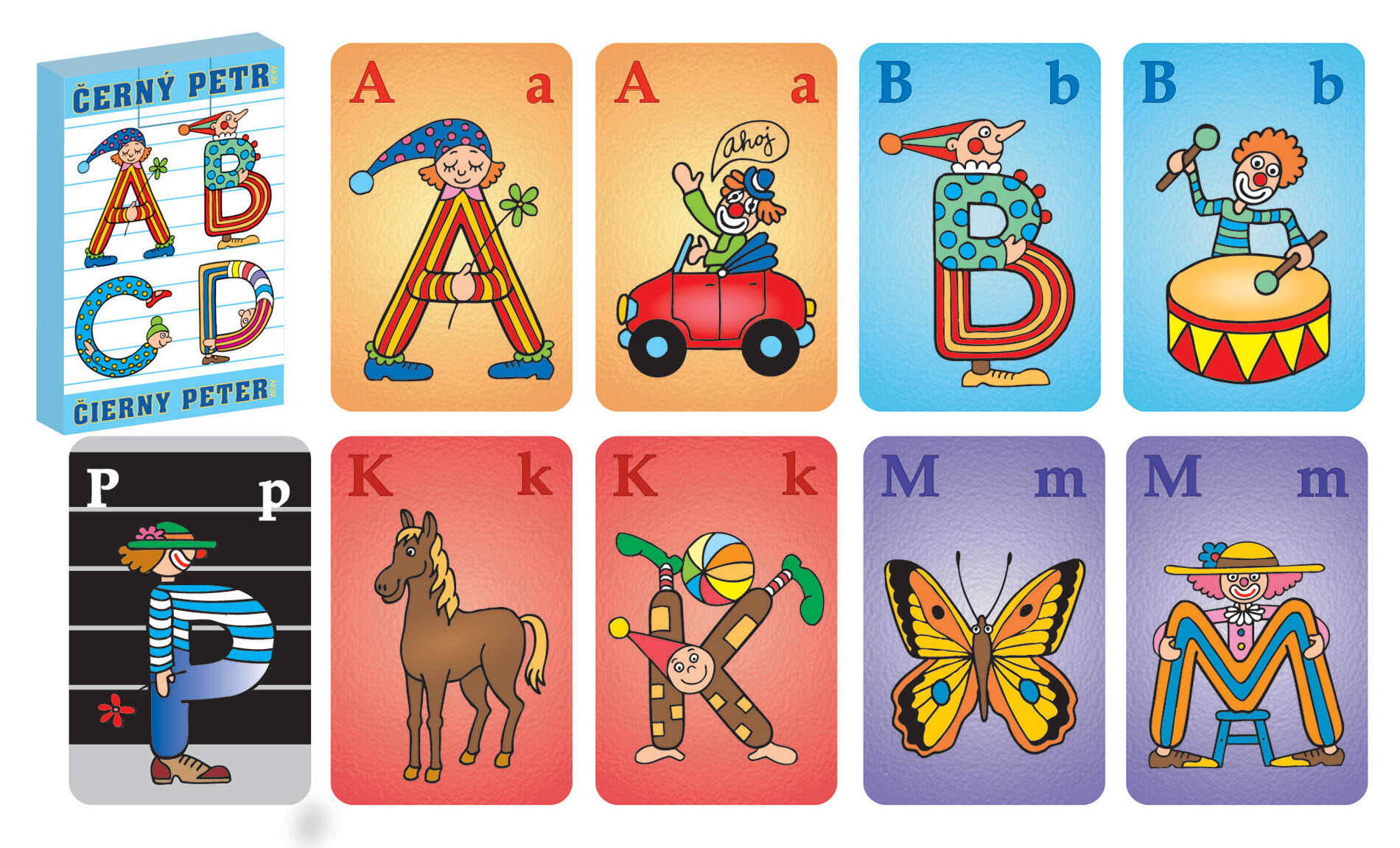- Obsahuje sadu karet s obrázky abecedy pro hru Černý Petr.