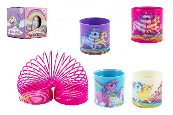 Spirála/ pružina jednorožec plast průměr 6,5cm 4 barvy v krabičce 7x7x7cm