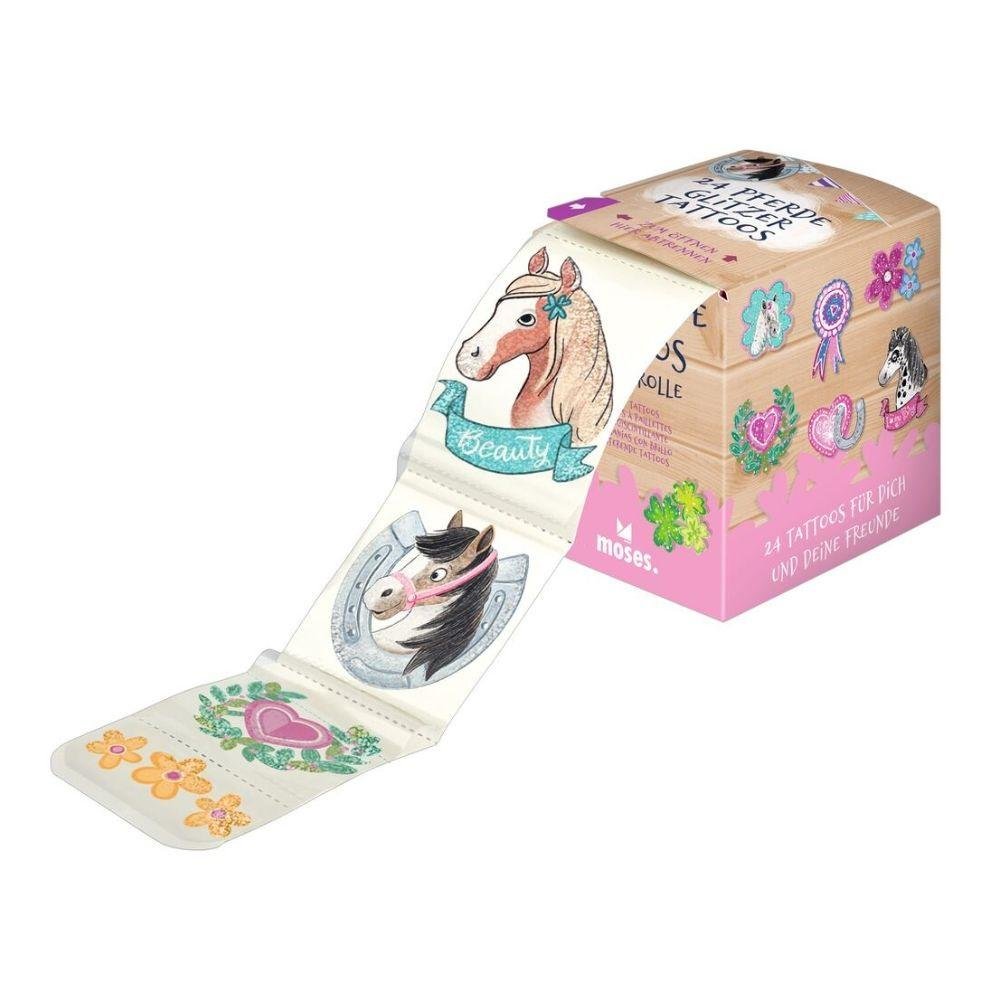 Brokatowe Tatuaże na Rolce, Konie Wyjątkowe tatuaże dla fanów koni: dzięki 24 fajnym, samoprzylepnym tatuażom z rolki, dzieci mogą tymczasowo ozdobić swoją skórę według własnego uznania. Świetne motywy z brokatem można łatwo oderwać od rolki i przykleić na wybraną część ciała. Dzięki wizerunkowi...