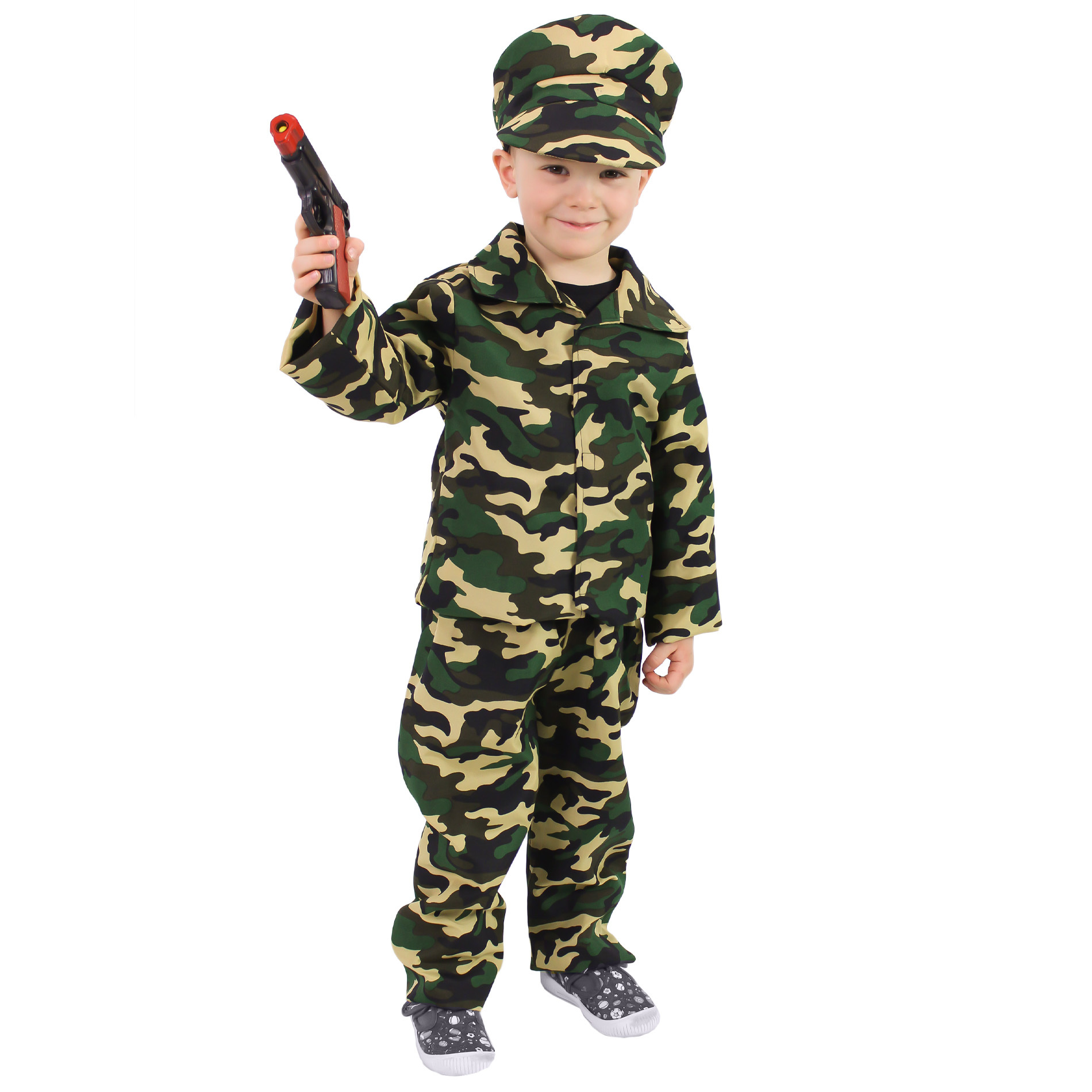 Karnevalový set pro opravdové vojáky! Tato sada obsahuje maskovací kalhoty, košili a stylovou čepici. Kostým vel. S je určen pro chlapečky ve věkovém rozmězí 4-6 let (105-116 cm). S tímto kostýmem vyhraješ rozhodně každou bitvu! číst celé