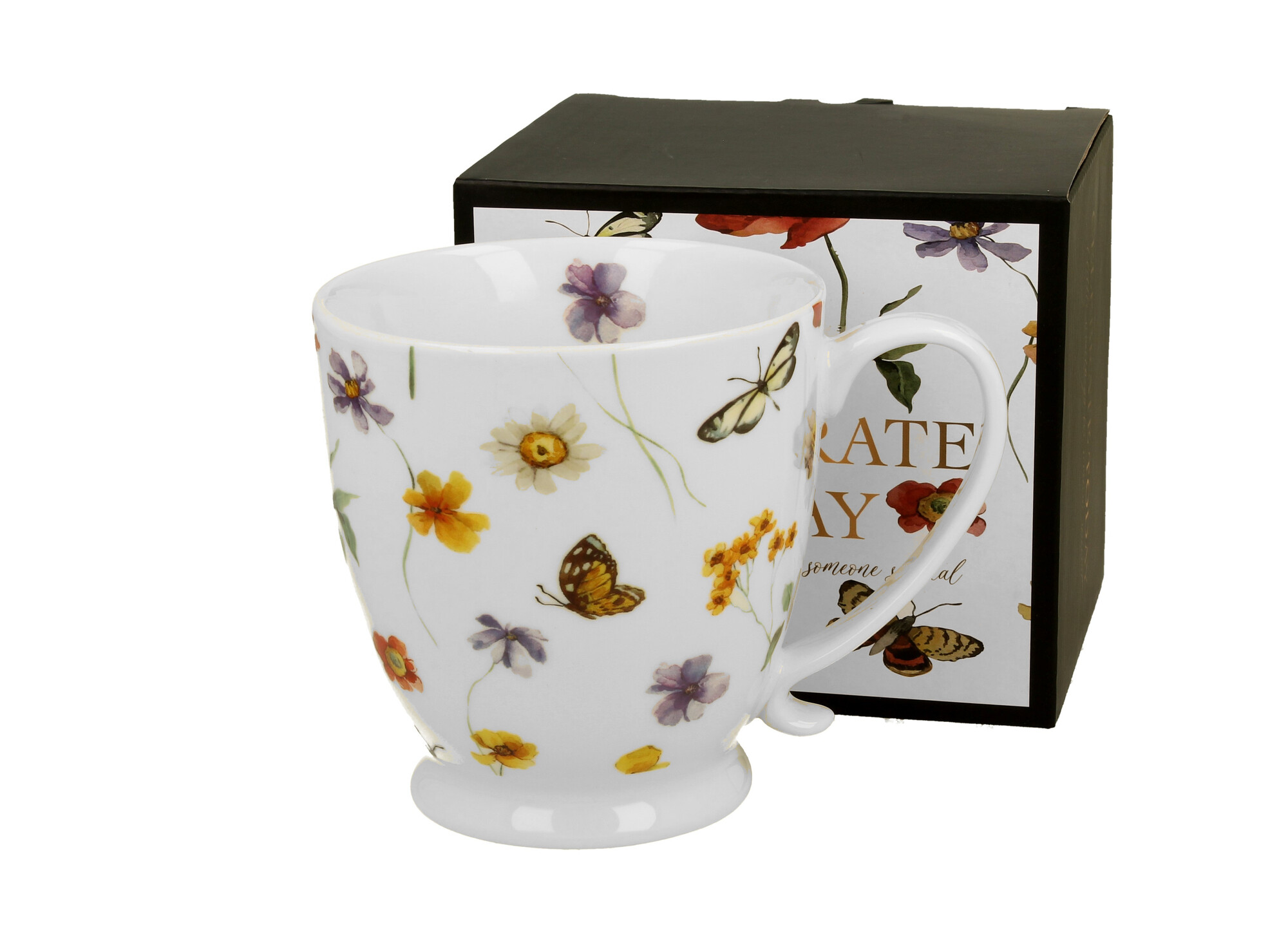 Kubek na stopce MARGARET wchodzący w skład serii Kwiaty Royal, wykonany z porcelany New Bone China, charakteryzującej się elegancką i naturalną kremowo - białą barwą z delikatnym połyskiem, a także wyjątkową wytrzymałością.Linia zdobiona wyjątkowym motyw inspirowany naturą – kolorowe motyle...