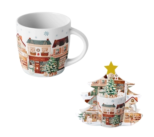 Porcelánový hrnek VÁNOČNÍ MĚSTO 2, 400 ml v papírovém košíku ve tvaru stromečku
