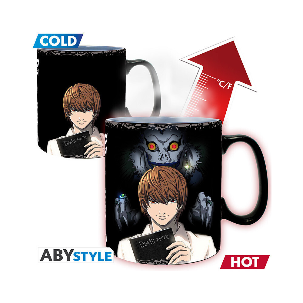 Hrnek Death Note - Kira & L o objemu 460 ml kombinuje praktickou velikost s efektním vzhledem, který zaujme každého fanouška série. Měnící se motiv dodává hrnku dynamiku - při nalití horkého nápoje se obraz mění a přináší tak originální vizuální zážitek. Tento hrnek nejenže poslouží při každodenním popíjení oblíbených nápojů, ale také potěší všechny, kdo milují napětí mezi Kiro a L z Death Note.
