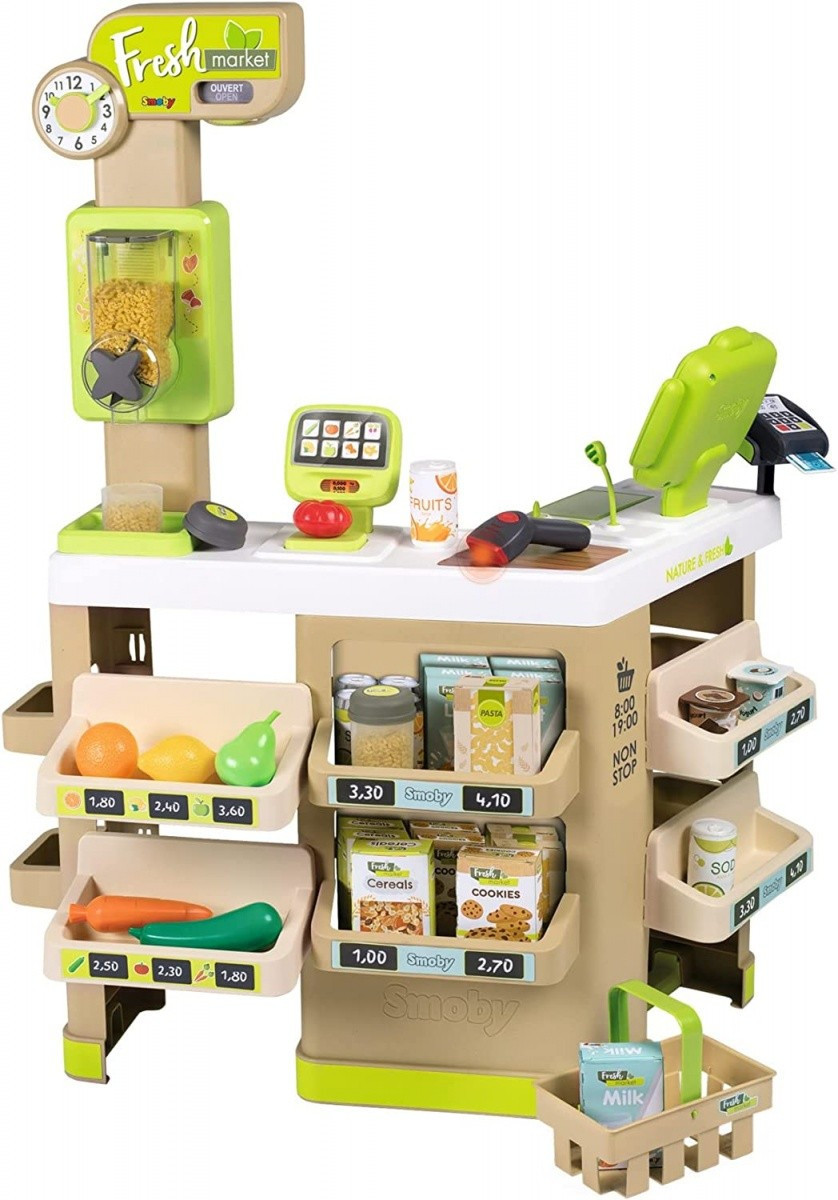 Fresh market Market ze skanerem z dźwiękiem i światłem, koszykiem, wagą, dozownikiem na płatki śniadaniowe, czytnikiem kart kredytowych, owocami, warzywami. Łącznie 43 akcesoria w tym: pojemniki, opakowania produktów, monety i banknoty. číst celé