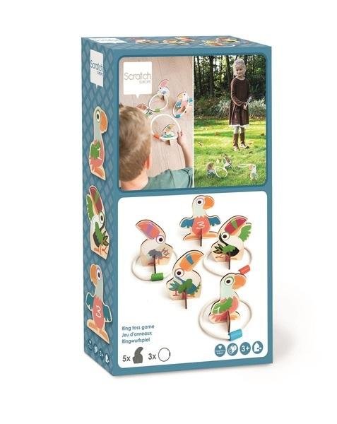 Drewniana gra zręcznościowa to wspaniała zabawa dla wszystkich wielbicieli zabaw ruchowych. Rzuć sznurkową obręcz tak, aby zaczepiła się na drewnianych figurkach w kształcie tukanów. Wyzwanie dla dużych i małych! Kto zdoła umieścić wszystkie obręcze wokół drewnianych tukanów i zdobyć najwięcej...