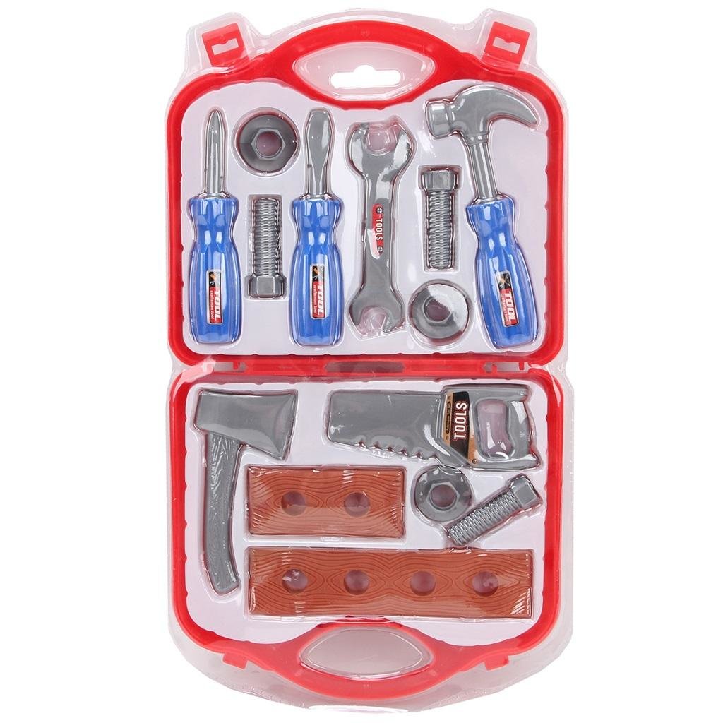 Zestaw zabawkowych narzędzi zapakowanych w poręczną walizkę. číst celé