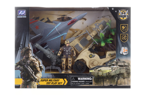 Vojenská sada obsahuje vojáka, stíhačku, motorku, vodní skútr a menší doplňky. Materiál plast. Baleno v krabičce. Rozměry balení cca 34x24x8 cm. Věk 3+ číst celé