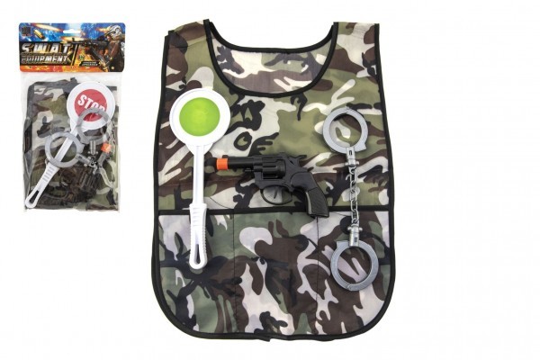 Policejní sada plast pistole klapací 15x9cm, pouta, plácačka, vesta v sáčku 18x32cm