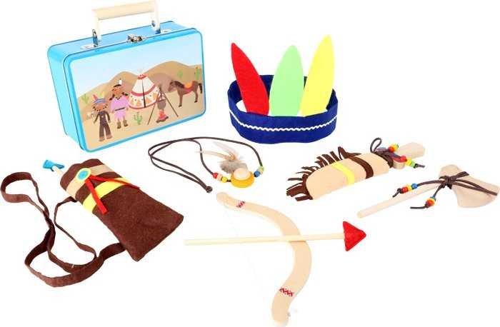 Tento krásně propracovaný kufr obsahuje vše potřebné pro autentické přestrojení: čelenka z plsti s barevnými péry, luk a šíp v plstěném pouzdře, sekera a nůž zdobené koženými pásky a barevnými korálky a samozřejmě indiánský náhrdelník. Díky kvalitnímu zpracování a použití certifikovaných materiálů mohou děti bez obav bezpečně rozvíjet svou fantazii a motoriku.