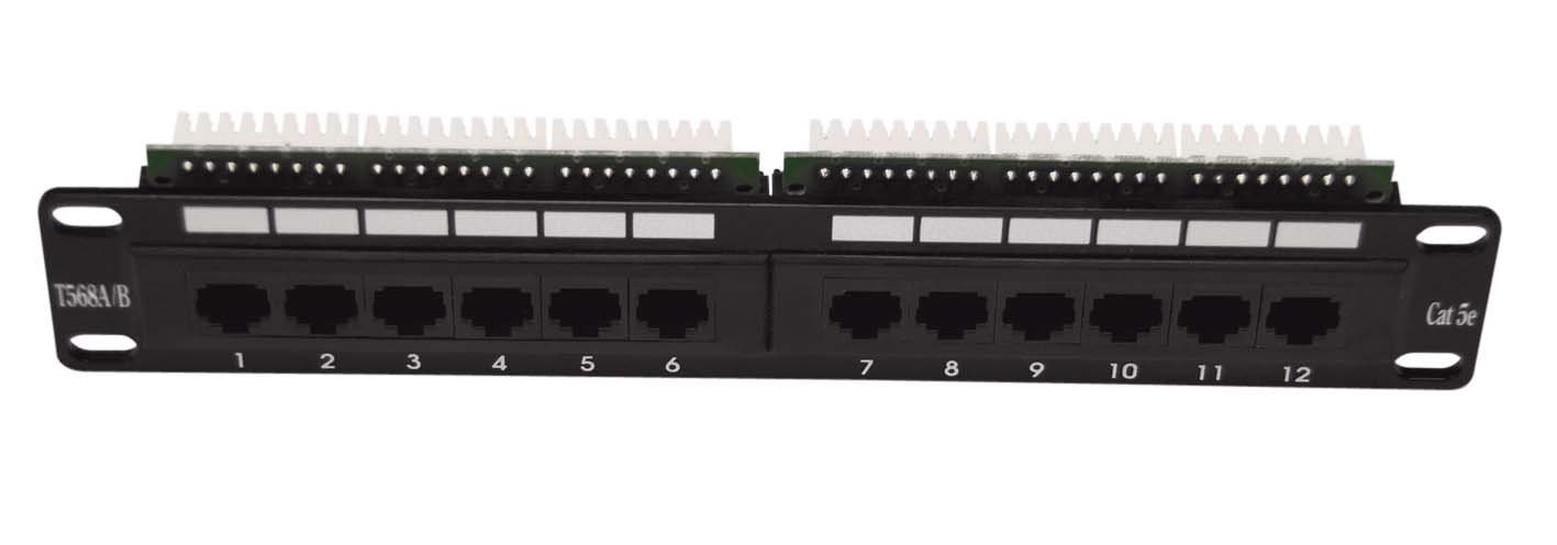 Patch panel, CAT5E, 10" provedení ,12 xUTP RJ45, černá barva12x port RJ45Cat5e EIA/TIA 568 a ISO/IEC 11801. nestíněné RJ45 konektory, 8P8C pro instalaci do 10" racku1U výškainstalace kabelů pomocí LSA u Krone nástrojebarevně rozlišené dle normy EIA/TIA 568 A & B černá barva číst celé