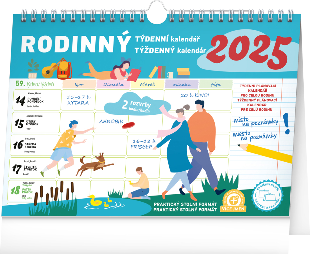 Kalendář má rozměry 30 × 21 cm, což z něj činí optimální velikost pro zaznamenávání poznámek i úkolů, ale zároveň nezabírá příliš místa na zdi. Je navržen tak, aby usnadnil koordinaci rodinných aktivit a přehled o plánovaných událostech měl každý člen rodiny na dosah ruky.