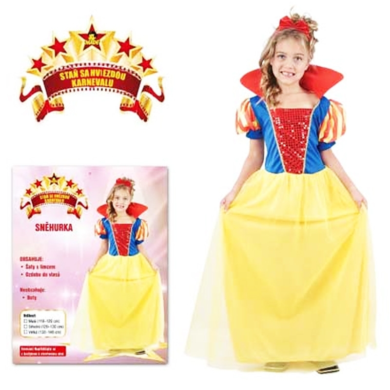 Karnevalový kostým Sněhurka, pro děti o výšce 110 - 120 cm.V balení naleznete: šaty s límcem a ozdobu do vlasů. cena je za balení. Vhodné pro děti 4+. číst celé