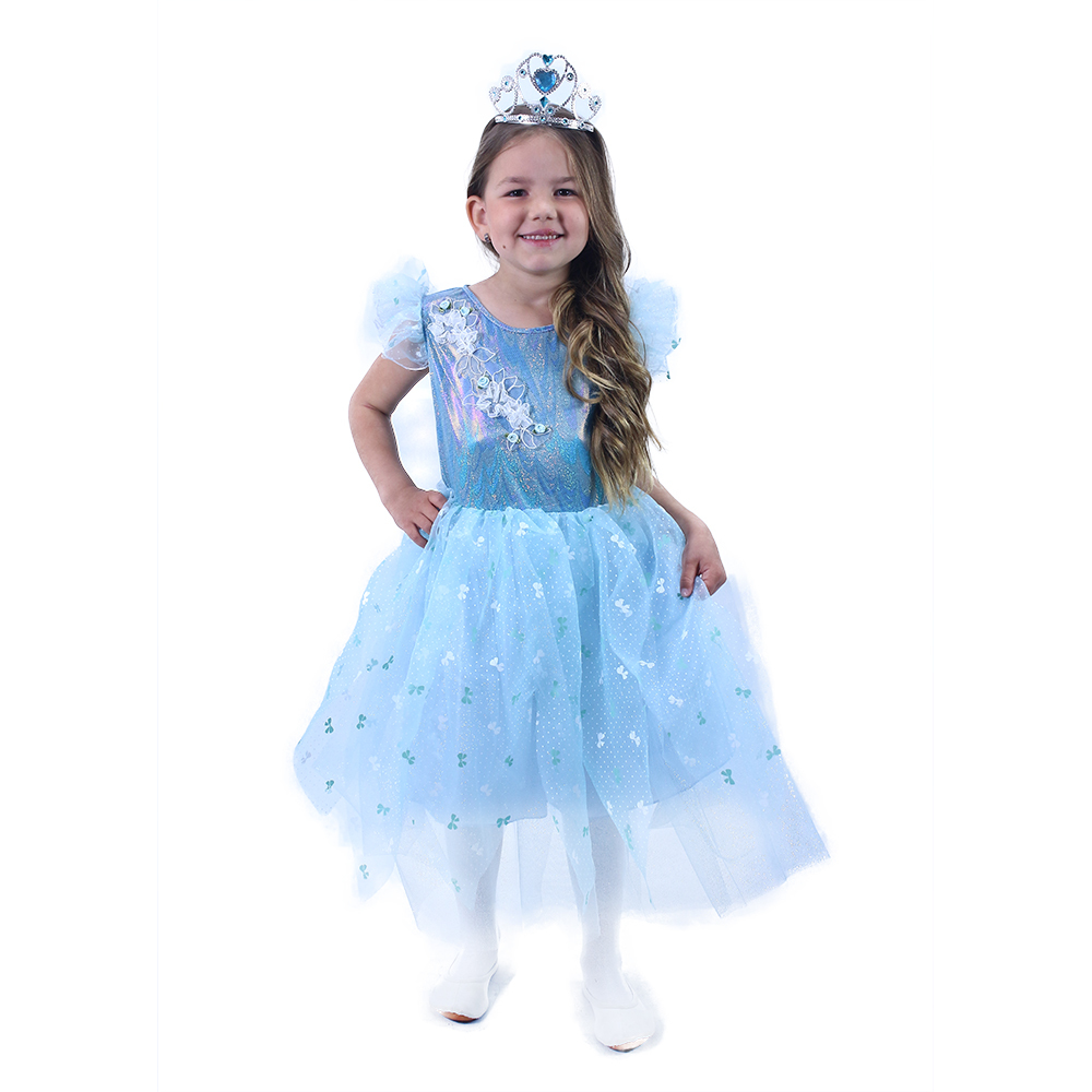 Úchvatný dívčí kostým pro princezny! Kostýmek modré barvy je kombinován s potištěným bílým tylem a v horní části je dekorován nášivkou květin. Kostým princezny ve velikosti M je určen pro holčičky ve věkovém rozmezí 6-8 let (117-128 cm). Délka sukýnky od pasu dolů cca 48 cm. číst celé