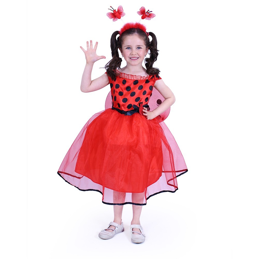 Krásné tylové šaty se saténovým vrškem s puntíky jsou v pase ozdobeny mašlí a beruškou. Žádné berušce nesmí chybět křidýlka a tykadla, proto jsou součástí kostýmu! Tento kostým ve velikosti M je určen pro děvčata ve věkovém rozmezí 6-8 let (116-128 cm). číst celé
