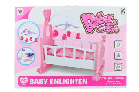 Plastová kolébka s příslušenstvím. Obsahuje kolotoč nad postýlku a set na jídlo s dudlíkem. Rozměry balení cca 53,5 x 11 x 40 cm. Věk 3+ číst celé