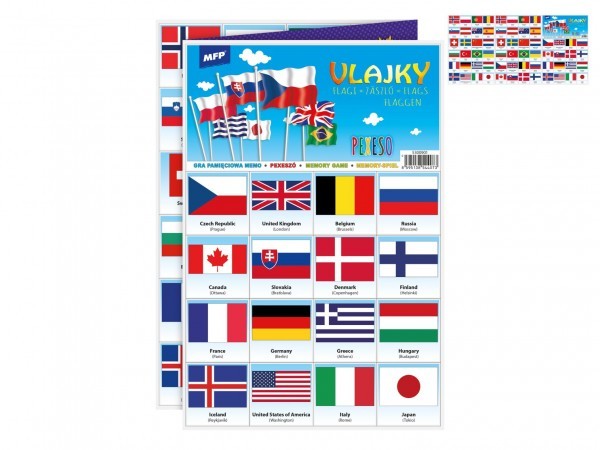 Pexeso s vlajkami obsahuje celkem 32 obrázkových dvojic, které jsou přehledné a barevně výrazné, což pomáhá lepší zapamatovatelnosti. Díky velikosti 21x30 cm jsou karty dostatečně velké pro jednodušší manipulaci a zábavnou hru i pro malé děti.