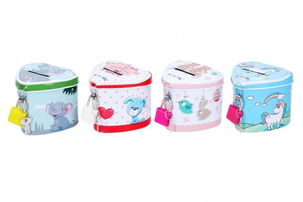 Pokladnička plechová srdíčko se zámkem 4 barvy v sáčku 8x7x6,5cm