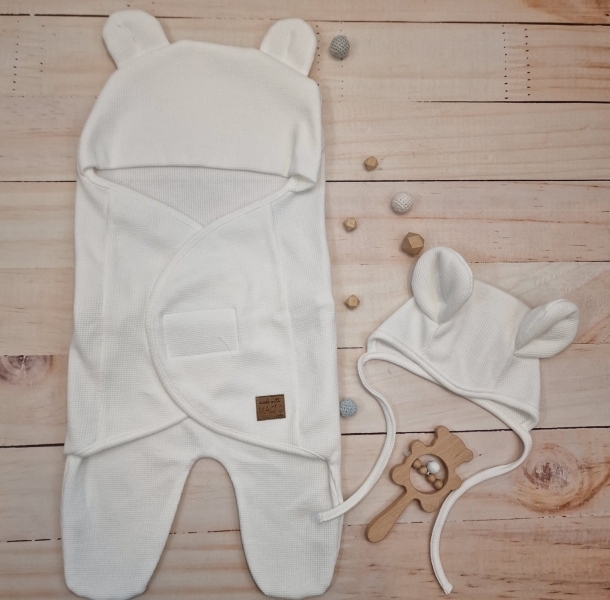 Univerzální zavinovačka, zavinovací deka + čepička, Medvídek, bavlna, bílá, 56/62; 56/62 (0-3m)