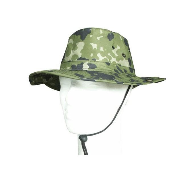Praktický klobouk pro volný čas - typ US. Široká krempa (cca 7 cm). Na obou stranách patentní knoflík ke zdvihnutí krempy. Podbradní šňůrka se zarážkou. Po stranách čtyři větrací otvory. Materiál: 65 % polyester, 35 % bavlna. číst celé