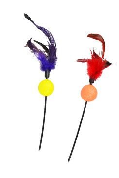 - Hračka ve formě udice s barevnými pírky a míčkem.