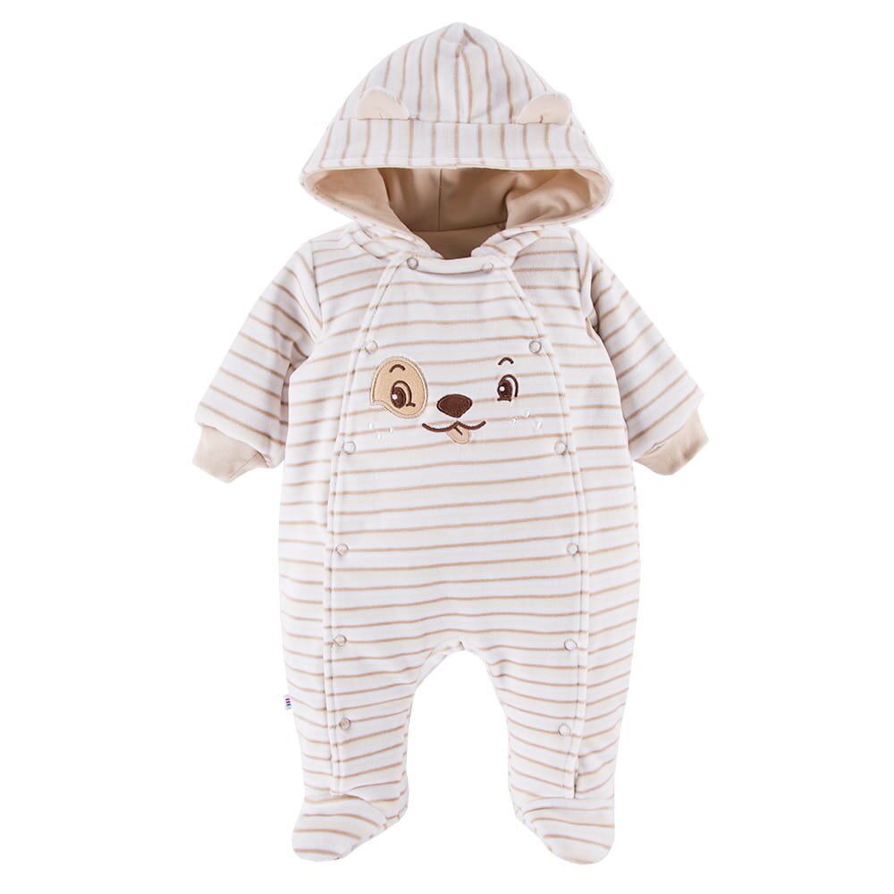 Kombinezon dziecięcy beżowy wykonany z ciepłego weluru. Kombinezon dziecięcy posiada kaptur i urocze uszka. Podszewka w kombinezonie wykonana jest w 100% z bawełny. Pajacyk z kapturem będzie idelany na wyjście ze szpitala w chłodne miesiące. W wyprawce dla dzieci rodzących się zimą i jesienią to...