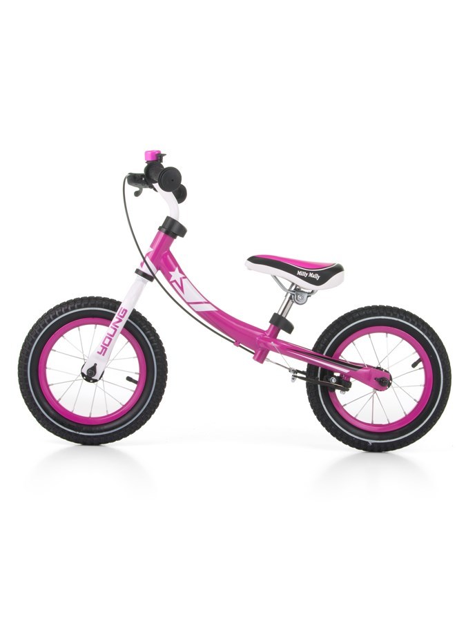 Dětské odrážedlo-kolo Milly Mally Young. - rám lze otočit- nastavitelná výška sedadla- stabilní a lehká ocelová konstrukce- protiskluzové rukojeti - pohodlné, měkké sedadlo- nafukovací kola, průměr 12"- zvonek- ruční brzda- maximální zatížení až 20 kg- délka od zadního k přednímu kolečku 89 cm-...