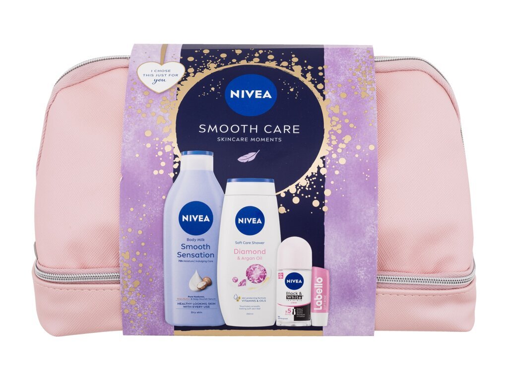 Nivea Smooth Care tělové mléko Smooth Sensation 400 ml + sprchový krém Diamond & Argan Oil 250 ml + antiperspirant Invisible Black & White Clear 50 ml + balzám na rty Labello Soft Rosé 4,8 g + kosmetická taštička