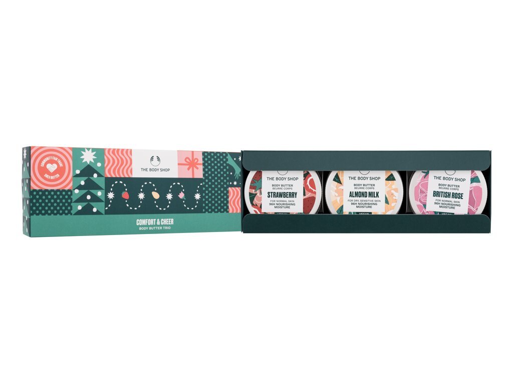 The Body Shop Comfort & Cheer tělové máslo Body Butter Strawberry 50 ml + tělové máslo Body Butter Almond Milk 50 ml + tělové máslo Body Butter British Rose 50 ml