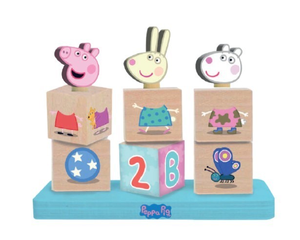 Dřevěné kostky Prasátko Pepa. Tyto dřevěné kostky je možné kombinovat společně postavičkami ze seriálu Prasátko Pepa.Z devíti kostek lze vytvářet různé figurky, oblčky, čísla, písmena a zvířátka.