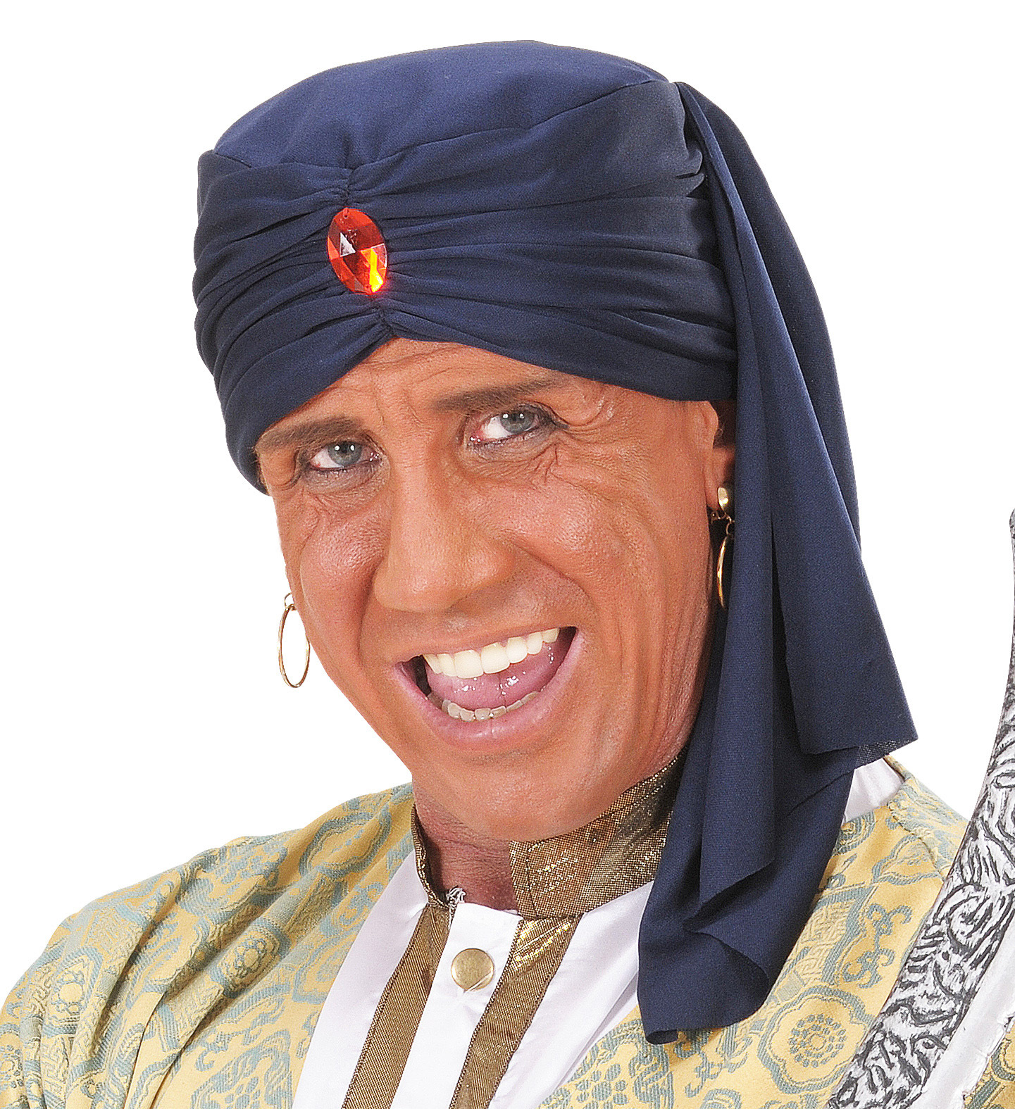 Turban Ali Baba v krásné modré barvě je perfektní volbou pro karnevaly, divadelní představení nebo tematické oslavy. Díky pružné gumičce se přizpůsobí obvodu hlavy o velikosti 42-58 cm, takže padne pohodlně téměř každému.