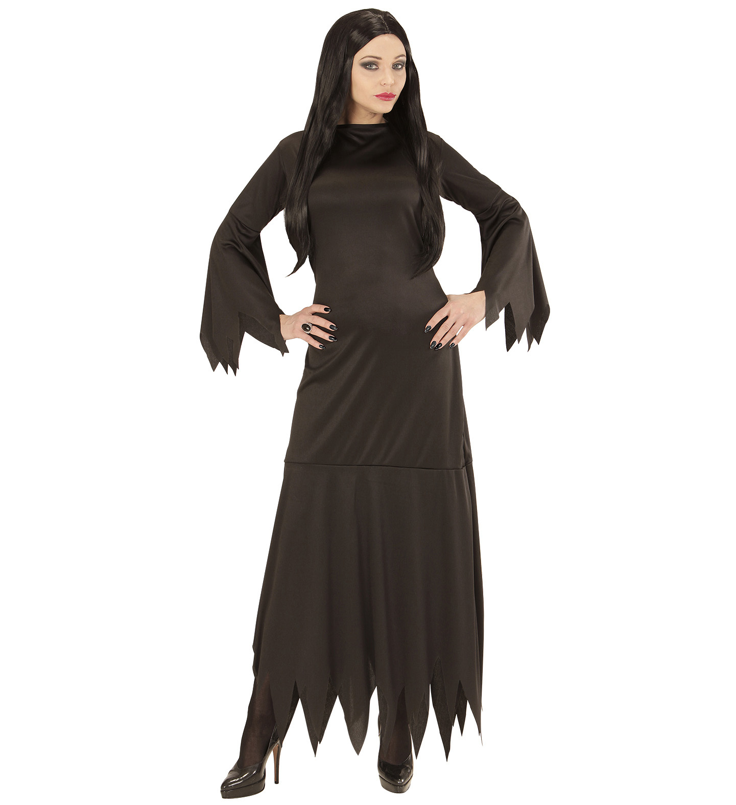 Černé šaty s elegantními zoubkovanými konci rukávů a spodního lemu dodají vašemu outfitu autentický čarodějnický vzhled. Kostým snadno doplníte parukou, make-upem nebo jiným příslušenstvím, čímž vytvoříte dokonalý převlek na Halloween, čarodějnický slet nebo tematickou oslavu.
