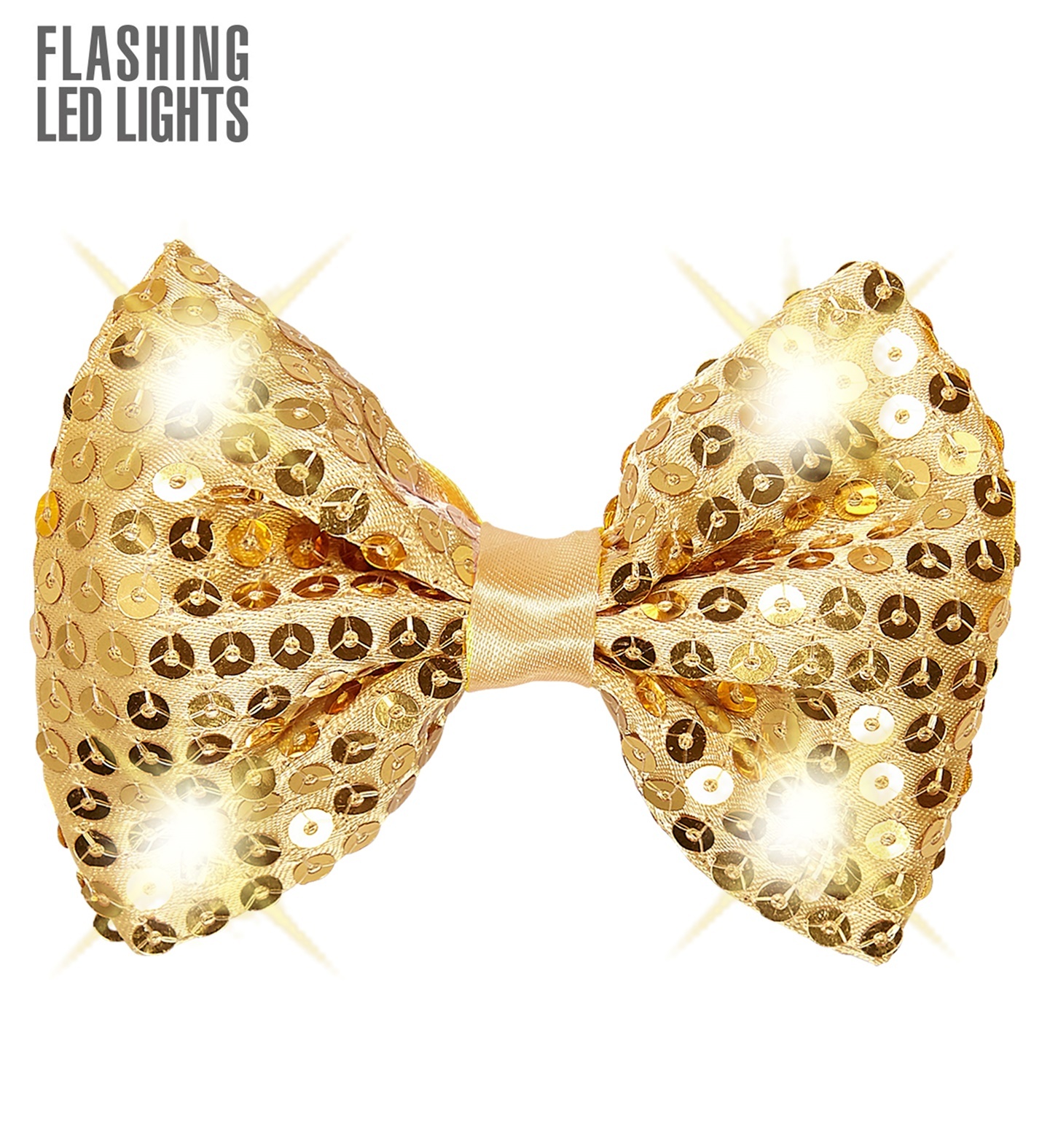 Nastavitelný zlatý flitrový motýlek se 4 LED světýlky Baterie: 3 x LR44 baterie jsou součástí balení Materiál: 90% polyester, 10% polypropylén číst celé