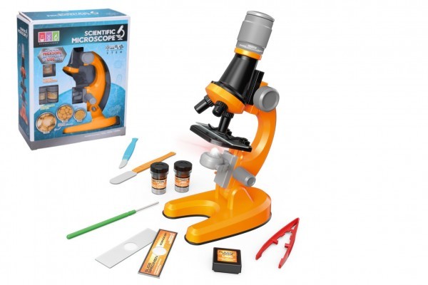 Mikroskop s doplňky plast 15x10cm na baterie se světlem v krabici 19x24x9cm