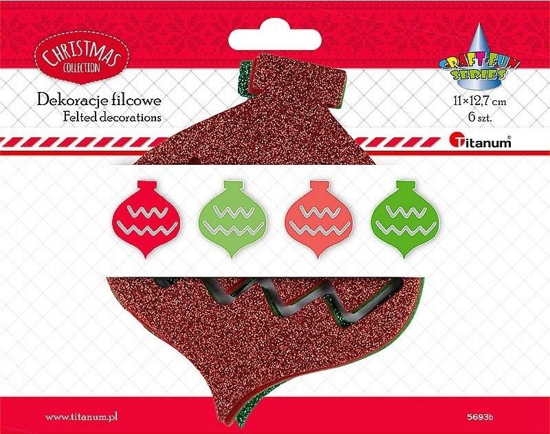 Miękkie, filcowe bombki. Wymiary: 110 x 127 mm. Kolory: zielony, czerwony, w tym dwie brokatowe. 6 szt. číst celé