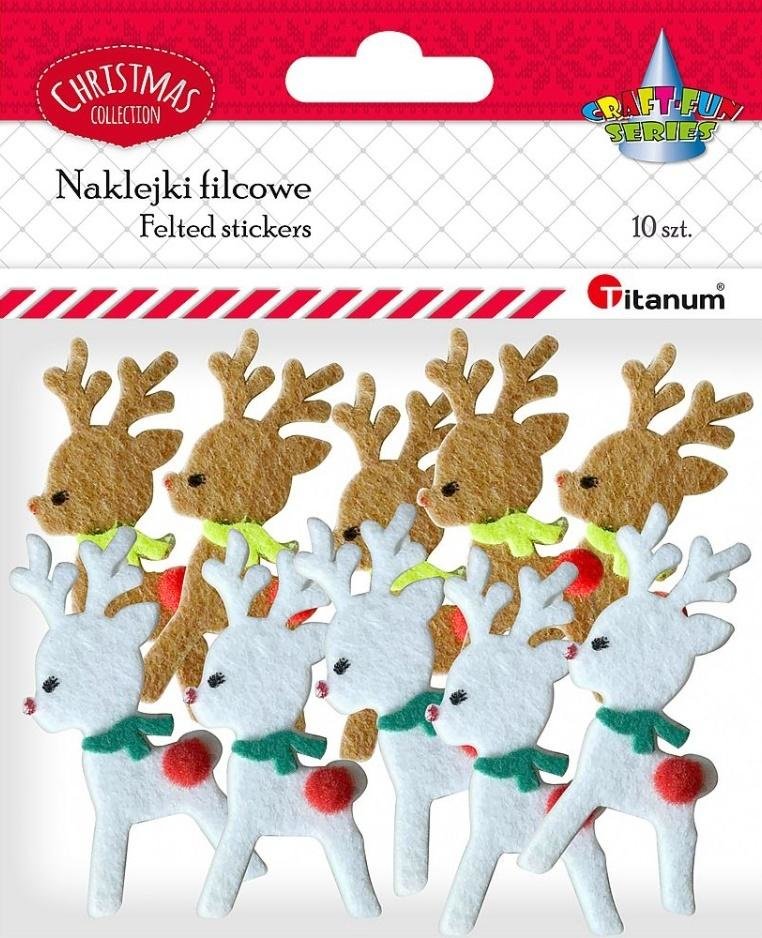 Naklejki filcowe 3D. Kształty: renifery. Kolory: biały, brązowy. Wymiary: 32x65 mm. 10 szt. číst celé