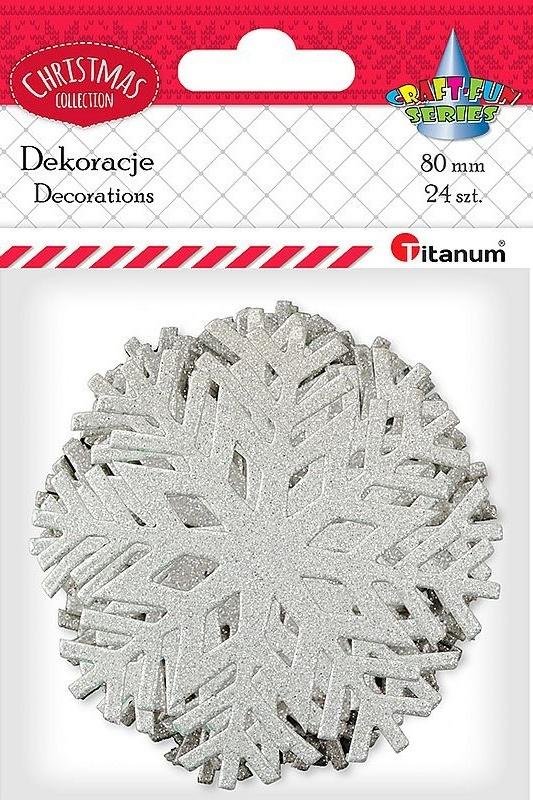 Naklejki dekoracyjne wykonane z grubego papieru. Wzór: płatki śniegu. Kolor: srebrny. Średnica: 80 mm. Blister 24 szt. číst celé