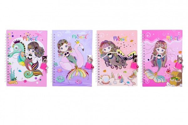 Poznámkový blok/notes mořská panna kroužkový linkovaný 48 stran se zámkem 4 barvy 14x18cm v sáčku